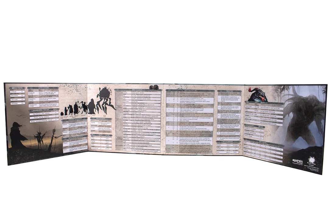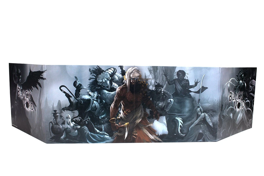 This four panel screen provides Arbiters with a practical barrier to shield notes and other information from the players as well as a range of convenient reference tables. The hand-picked cover art helps set the scene and enhance the ambient atmosphere on the gaming table for all your adventures in the BLACK VOID.