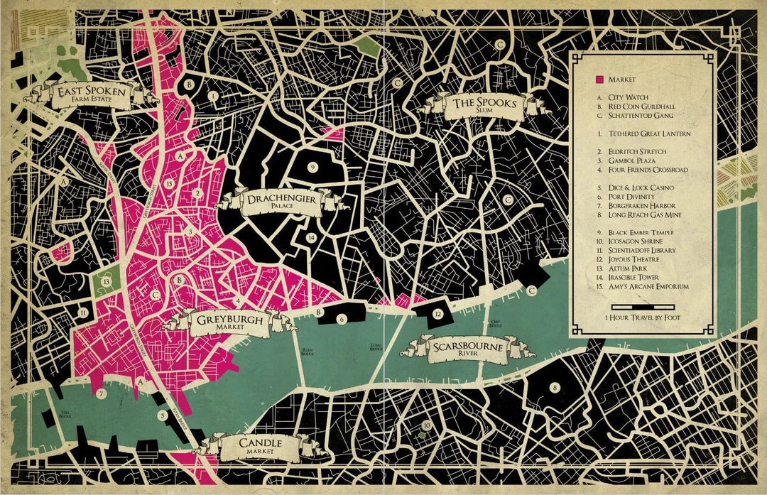 The Scarsbourne river draws fleets of mercantile vessels from the vast reaches of Aeternum to Greyburgh Market, there to divest their exotic cargo, and disembark cloaked strangers from far-flung places. The market is a crossroads and a dumping ground for some the most arcane and esoteric oddities coughed up by vagabonds, traders, the dead and the dissolute. Any goods and services imaginable can be found for sale among the market’s sprawling warrens of shops, stalls, tents and stands, and for the right price, any dream can be bought, and nightmares are sold for a song.