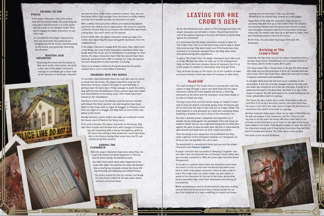 It Started and Ended with Screams: The players are all teenagers that are sent to St. Jude’s Centre for Troubled Youths. Here, in this strict institution, where the windows are barred and the doors are locked they soon discover that this place has many secrets. This is a scenario based around human drama, systemic abuse and desperate pacts. It is written by Matthew Dawkins who also wrote The Summit for the previously released scenario collection Taroticum and Other Tales. He is perhaps mostly known for his many contributions to the World of Darkness setting but here he again embraces the KULT mythology in a very daring and intimate scenario.