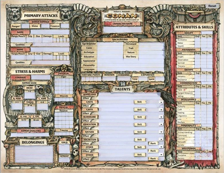 Also comes with a download for six FREE character PDF sheets for the Conan RPG, featuring basic, inked and extended versions, for your barbaric pleasure! Â