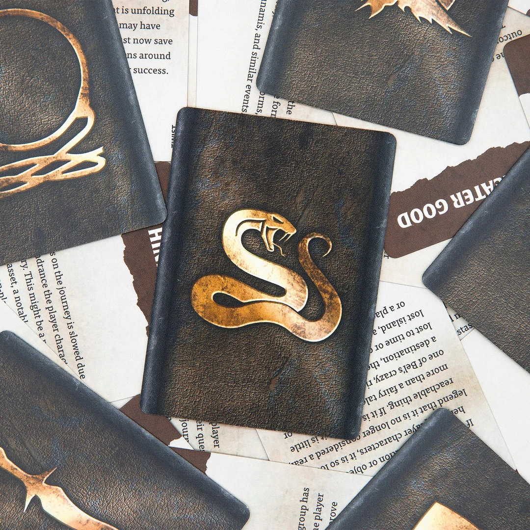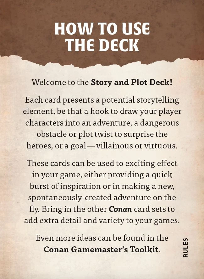 The Hyborian Age is rife with stories. This deck is a useful and exciting resource for Conan gamemasters. Its cards will help you to craft your own stories with unique narratives, challenges, environments, and plot twists with ease! Plan ahead or randomly take the story into a fresh new directions, depending on your gamemastering style. Surprise your players, and yourself!