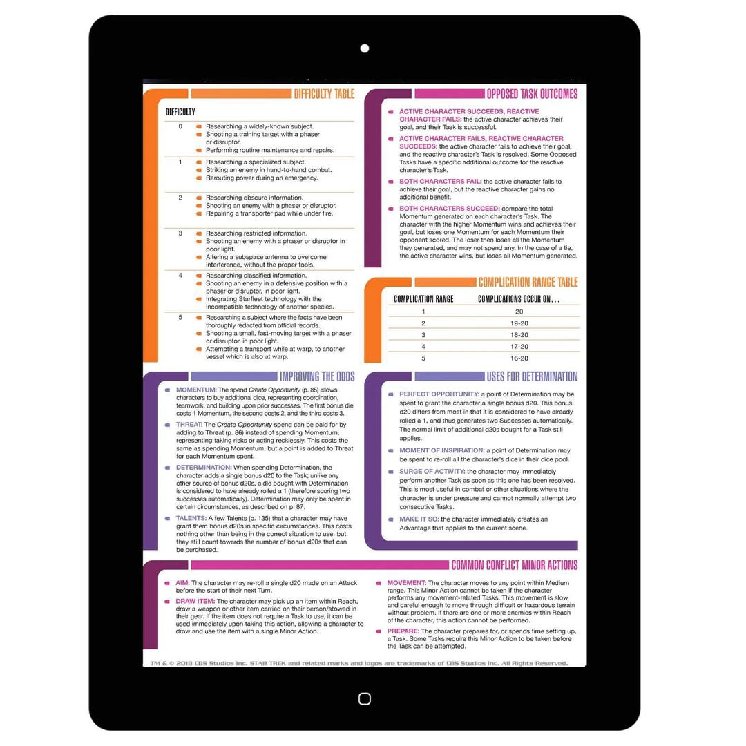 The official Star Trek Adventures Gamemaster Screen is a PDF of a three panel screen to help power your Star Trek missions. The exterior features beautiful rendered artwork of Starfleet vessels and Romulan cruisers, while the inside cover contains useful rules references, tables, charts and random generators for Gamemasters so the 2d20 system is at your fingertips!